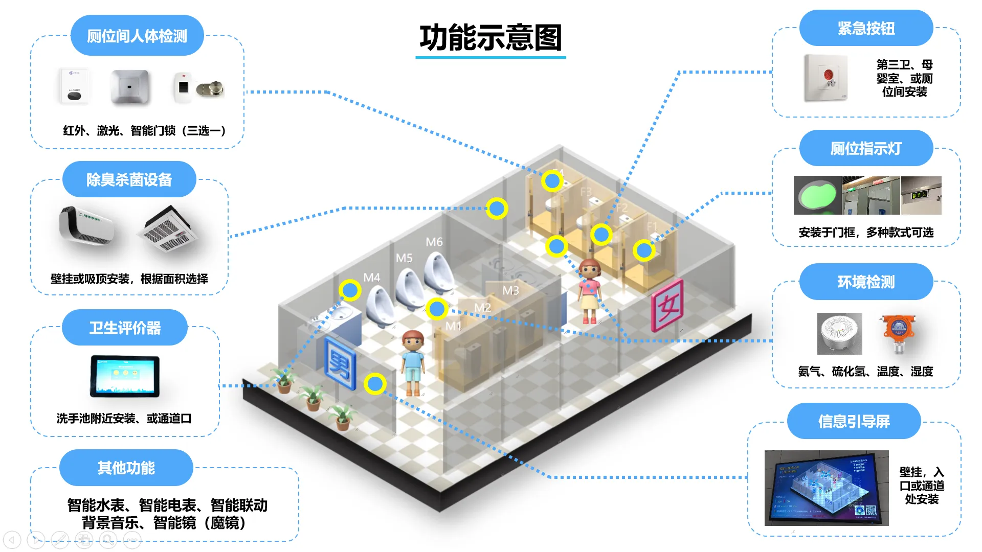 最后,智慧廁所系統(tǒng)還具備智能化的環(huán)境控制功能,例如自動感應(yīng)燈和空氣除味系統(tǒng),使廁所空間始終保持舒適和潔凈。此外,還可以通過智能音頻設(shè)備提供背景音樂或有聲讀物,為用戶提供更好的使用環(huán)境和體驗。